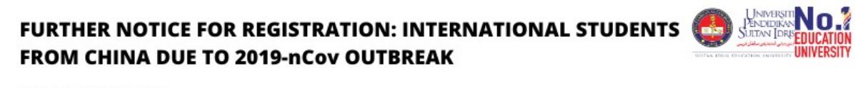 Registration will be postponed until further notice; however, the offer letter for a new student is valid until September 2020. We also regret to inform that the Orientation Day for International Student (Semester 2 Session 2019/2020) on 12th February 2020 has been postponed until further notice.